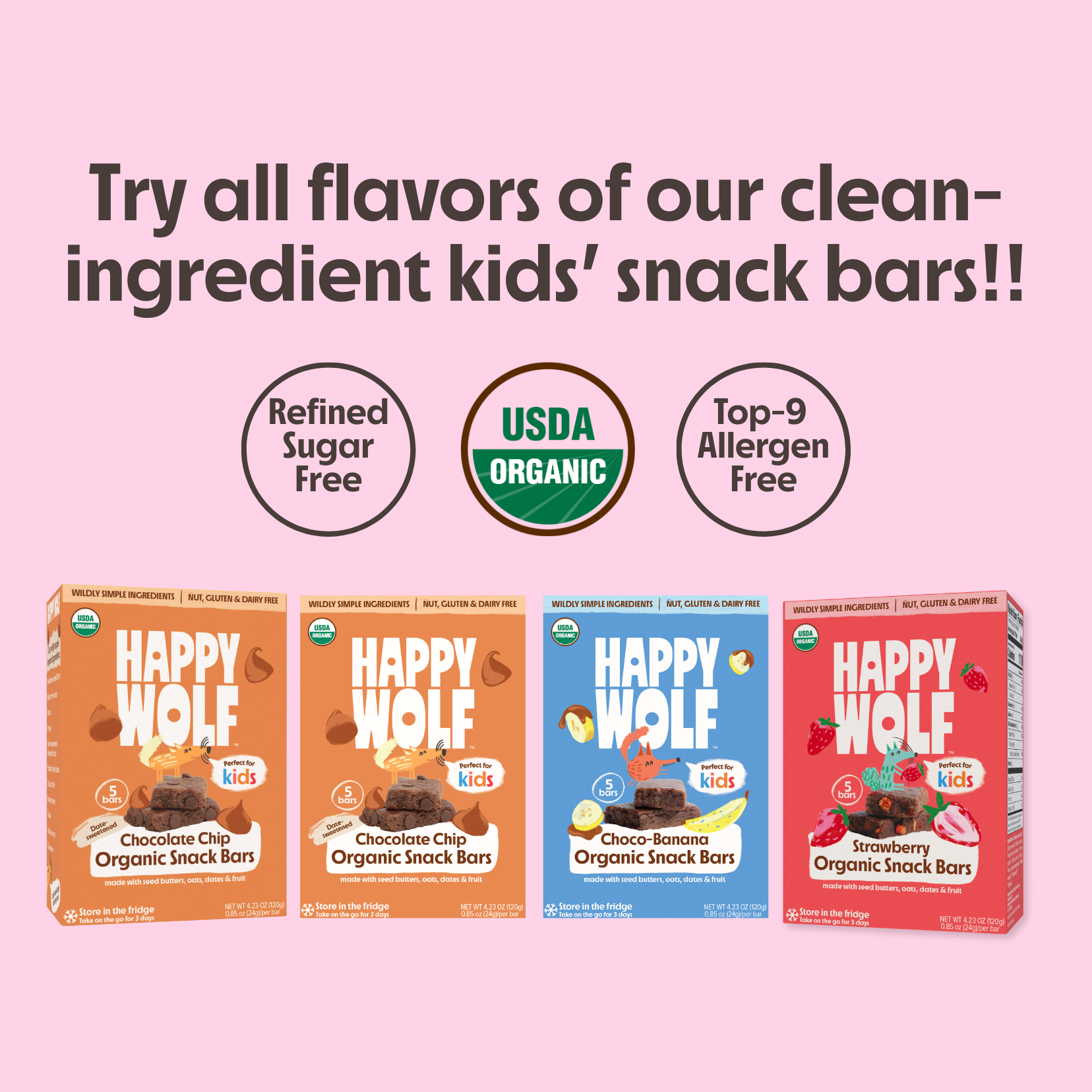 We only use ingredients you’d find in your kitchen: a base of sunflower seed butter, gluten-free oats and pureed + dried fruits, plus a touch of real-food sweetness from dates and honey. We believe that kids don’t need ultra-processed nutritional powders — just whole food. If your kid can’t pronounce it, you can’t find it on our labels.