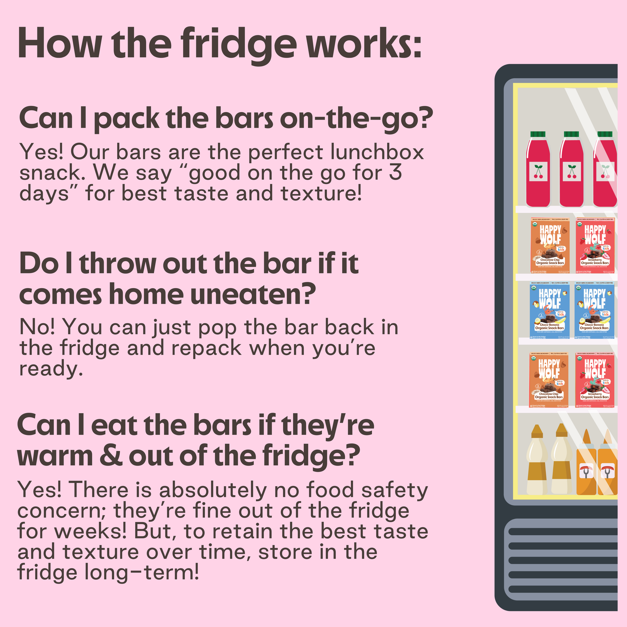 Because we don't use any preservatives, our bars are stored in the fridge! They are good on the go for 3 days, so if a bar comes home uneaten, just pop it back in the fridge!